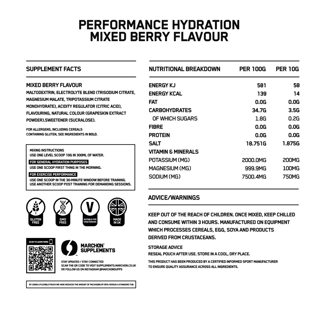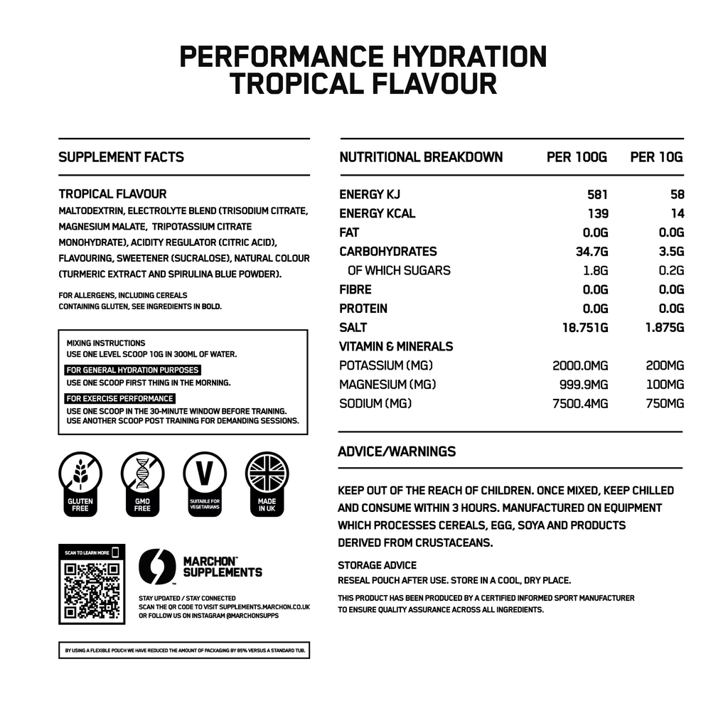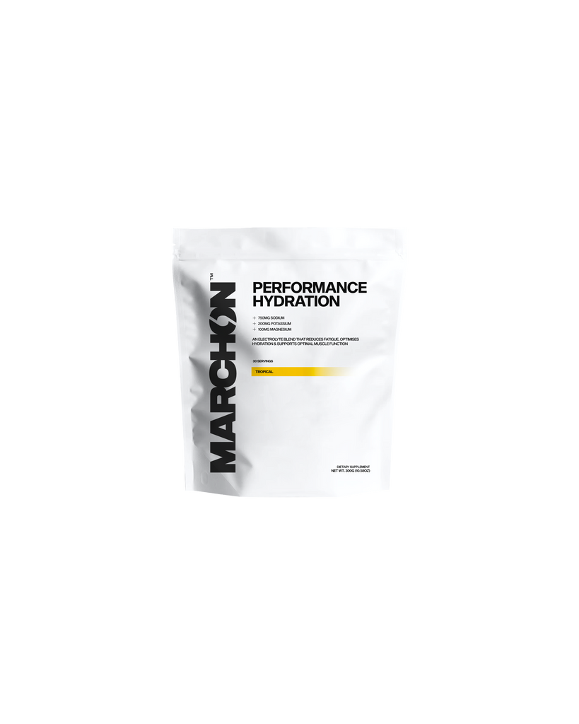 MARCHON™ Performance Hydration Electrolyte Powder is designed specifically to provide the body with the fluids, electrolytes, and nutrients it needs to maintain performance during intense exercise.